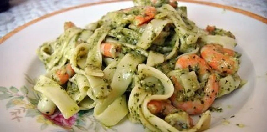 Фетучини аль денте с соусом песто и креветками