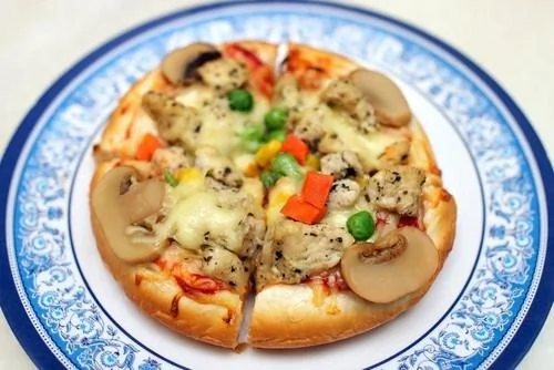 Пицца с рыбой, грибами и зеленым горошком
