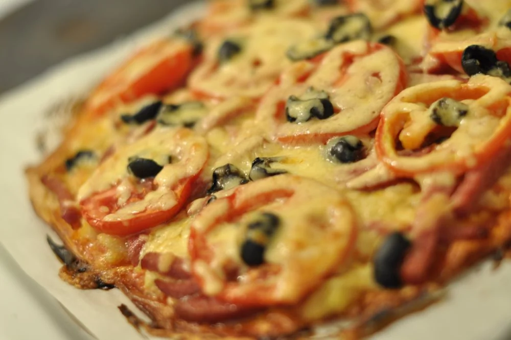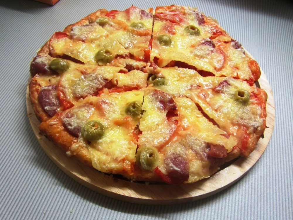 Пицца на тонком тесте с колбасой и картофельным пюре