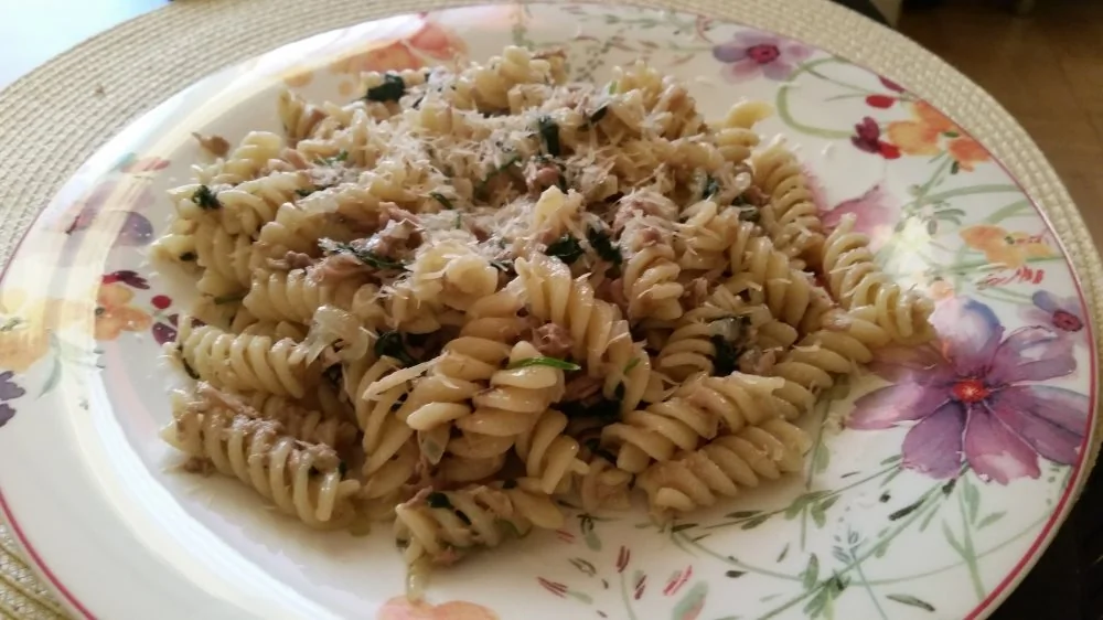 Ингредиенты для приготовления Фузилли с тунцом и шпинатом: