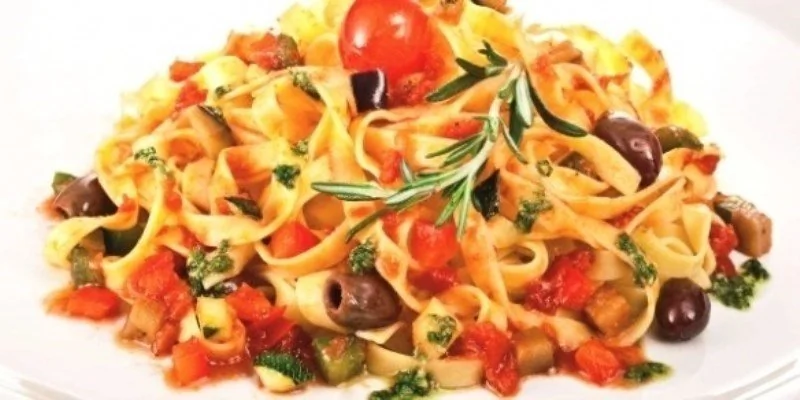 ШАГ 2 Отвари фетучини. Нарежьзать баклажаны, цукини, перец и помидоры на квадратики. Посыпать рубленной зеленью, специями.