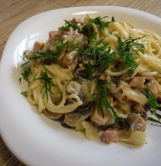 Паста с грибами и ветчиной