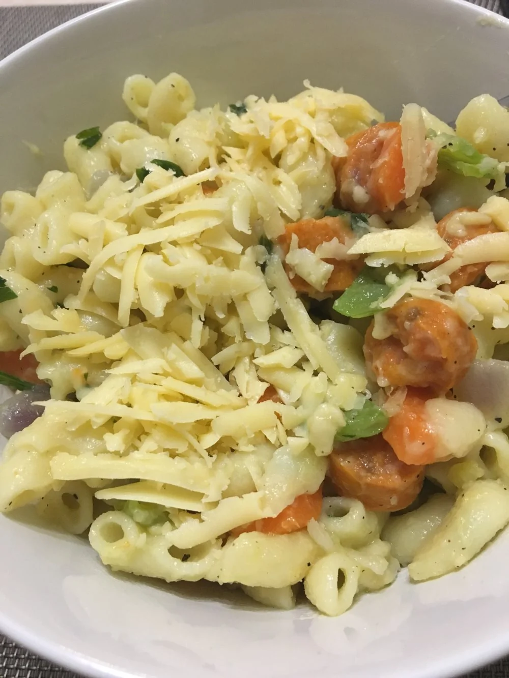 ШАГ 4 В чашу к овощам добавьте макароны и хорошую порцию пармезана, тщательно перемешайте, добавляя по 1 столовой ложке воды от макарон, если соус получится слишком густым.