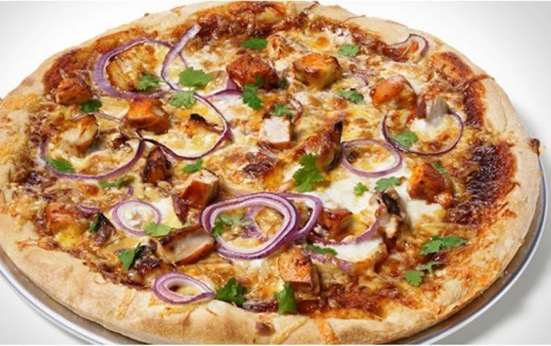 Пицца с соусом барбекю, копченым сыром гауда, куриным филе и красным луком
