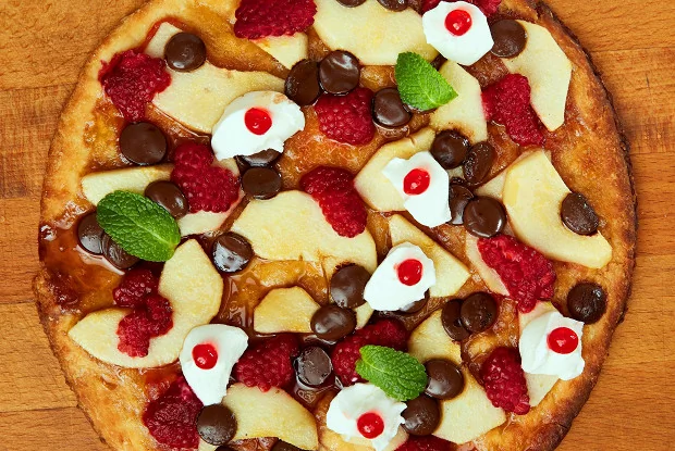 Сладкая пицца с грушей в карамели малиной и крем сыром