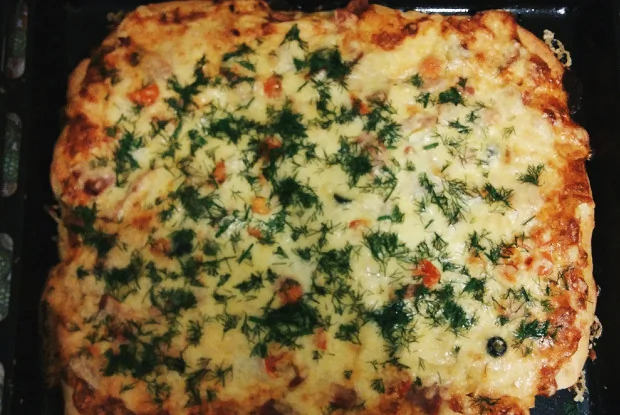 Пицца с колбасой на жидком тесте