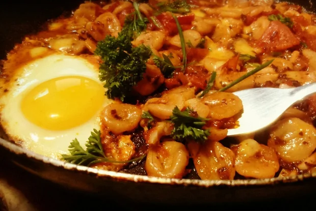 ШАГ 7 Когда яйцо в сковороде уже дошло до кондиции, соус загустел и уварился, а сыр растаял — снимаем с огня, посыпаем любимой зеленью и бежим кушать. Приятного апетита.