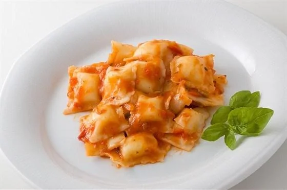 ШАГ 4 Опустить равиоли в кипящий бульон и варить при слабом кипении. Как только они всплывут, вынуть шумовкой и уложить на блюдо. Посыпать равиоли оставшимся тертым сыром и полить горячим томатным соусом.