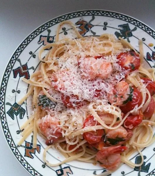 ШАГ 4 Сливаем воду из кастрюли, в которой варили лингвини, и добавляем к пасте жареные креветки с помидорами черри, мелко нарезанный базилик, петрушку и выжатый лимонный сок. Перемешиваем и оставляем на несколько минут, чтобы паста пропиталась получившимся соусом.