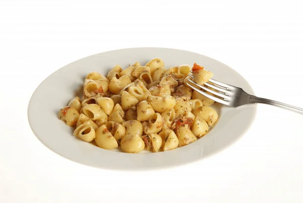 ШАГ 5 Почти готовую пасту, переложить в сковородку к иваси и перемешать, если кажется, что соус слишком густой, можно добавить немного воды из-под пасты.