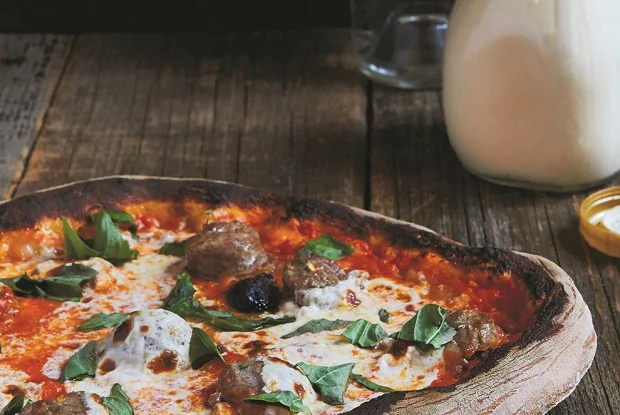 ШАГ 15 Выключить гриль. Аккуратно переложить пиццу с лопаты на пекарский камень или лист. Закрыть дверцу духовки, перевести ее в режим выпечки при 290 градусах. Выпекать пиццу примерно 5 минут, пока бортик не станет золотистым. Перевести духовку в режим гриля и выпекать 2 минуты, пока сыр полностью не расплавится, а основа не станет золотистой с небольшими подпалинами (через минуту проверить). С помощью щипцов или вилки переложить пиццу на большую тарелку. Ножницами нарежзать листья базилика и посыпать ими пиццу. Подавать сразу.