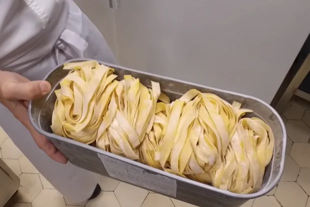 ШАГ 5 Обрезать неровные края раскатанного теста. С помощью насадок на паста-машине разрезать тесто на желаемую пасту (паппарделле, тальолини). Из обрезанного теста также нарезать пасту мальтальяти (ее можно использовать в супах). Просушить пасту в теплом, сухом месте.