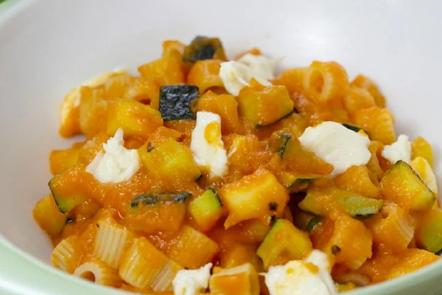 ШАГ 4 Тем временем разогреть в сковороде растительное масло, нарезать кубиками цукини и обжарить их до золотистой корочки. Влить томатный соус и дать ему прогреться. Смешать соус и цукини с пастой, добавить базилик и моцареллу.