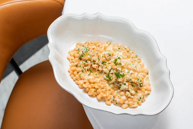 ШАГ 1 Смешать манку, манитобу, семолу, желтки и 5 грамм соли, заварить 130 мл горячей воды, вымешать миксером и дать настояться от часа до полутора в холодильнике под пленкой. Сформовать из теста шарики весом по 1–2 грамма и бросить в муку, чтобы в процессе они не слиплись.