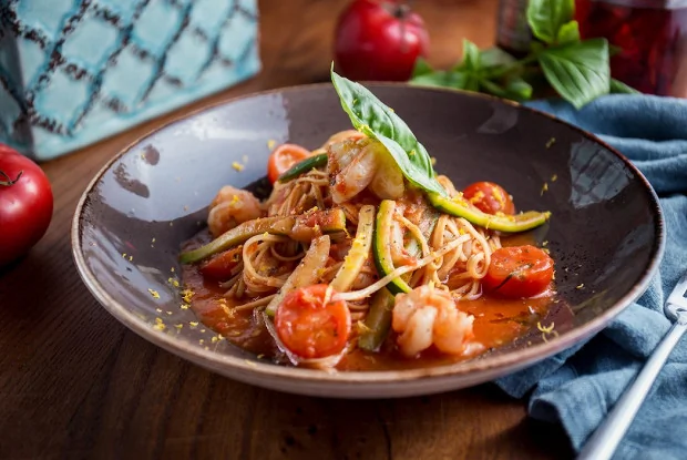 ШАГ 5 Выложить пасту с креветками на тарелку и украсить листьями базилика.
