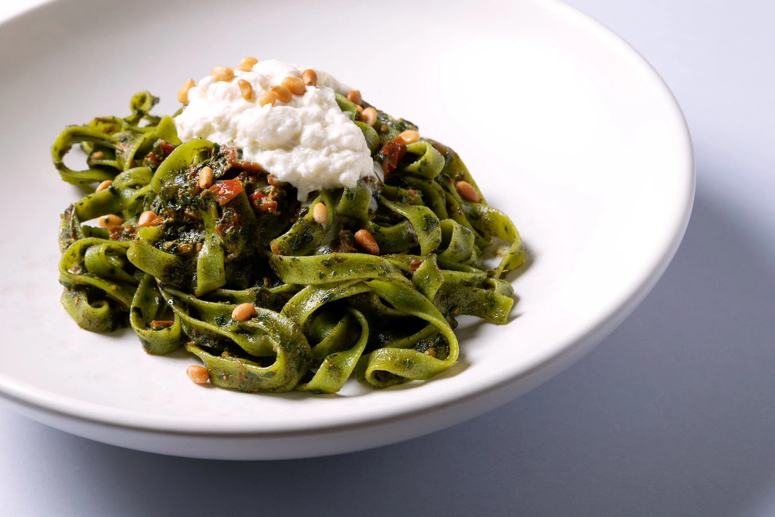 Шпинателле со страчателлой, вялеными томатами и соусом песто
