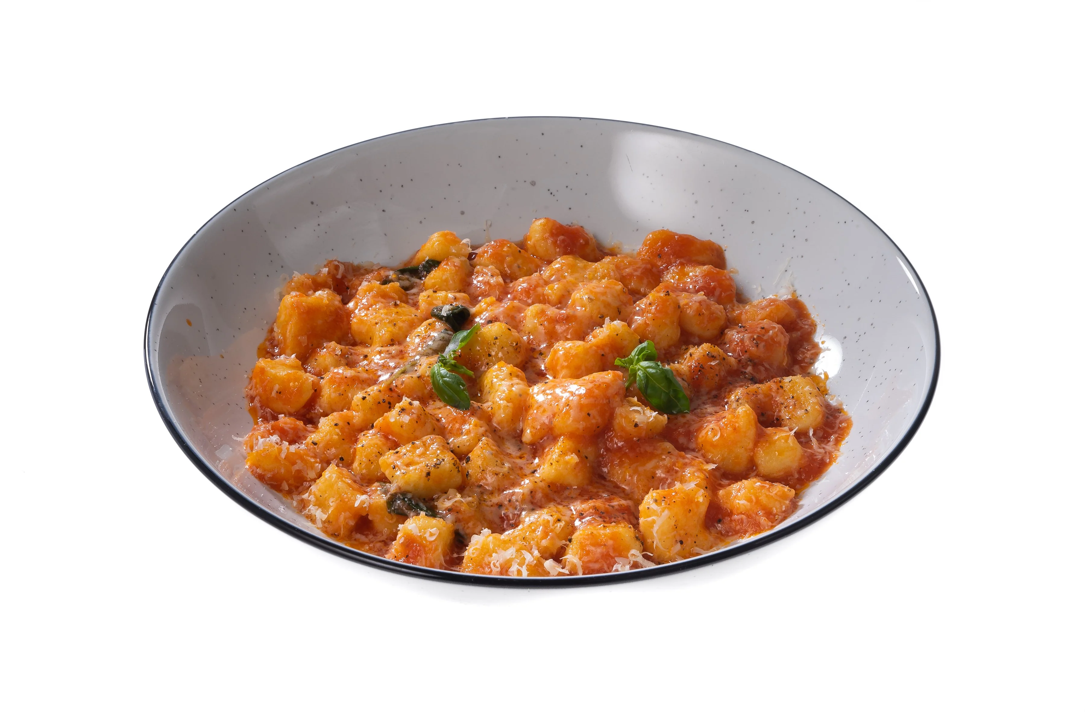 ШАГ 9 Выложить ньокки в порционные тарелки, поперчить, потереть сверху сыр и украсить свежими листьями базилика.