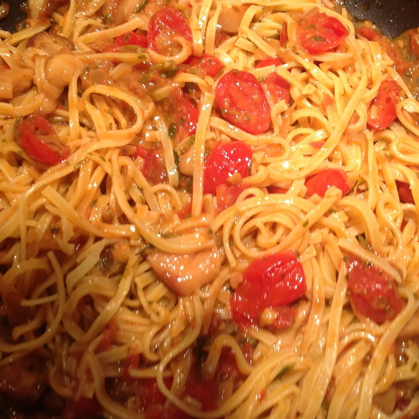 ШАГ 2 Измельчить шалот, обжарить его на оливковом масле вместе с розмарином, шалфеем и петрушкой. Через несколько минут отправить к луку ножки грибов, спустя минуту добавить 120 мл вина и помидоры, поперчить.