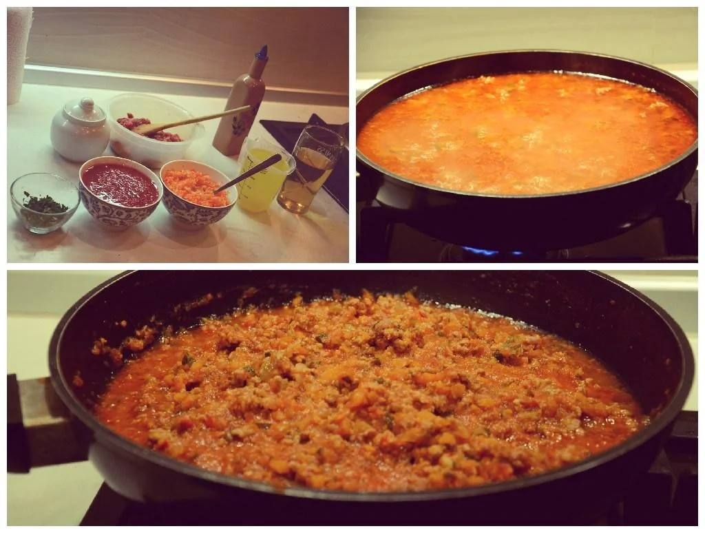ШАГ 2 Увеличьте огонь и добавьте мясо. Перемешайте деревянной лопаткой, разломав комочки. Добавьте бульон, вино, помидоры, сахар и петрушку. Доведите до кипения, уменьшите огонь и тушите 1,5 часа, иногда помешивая. Посолите и добавьте специи.