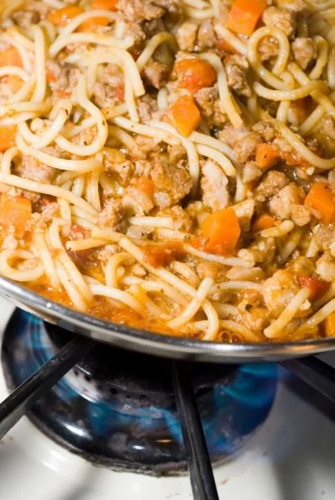 ШАГ 2 Разогрейте оливковое масло в большой сковороде на среднем огне и обжарьте мелко нарезанный лук 3-4 минуты. Добавьте измельченный чеснок, чили, нарезанные грибы и фарш из сосисок, небольшими комочками. Жарьте на большом огне, активно помешивая, чтобы разбить мясные комочки примерно 4-5 минут до подрумянивания фарша. Помешивая, жарьте 10 минут, по необходимости удалив лишний жир.