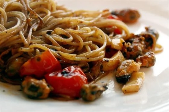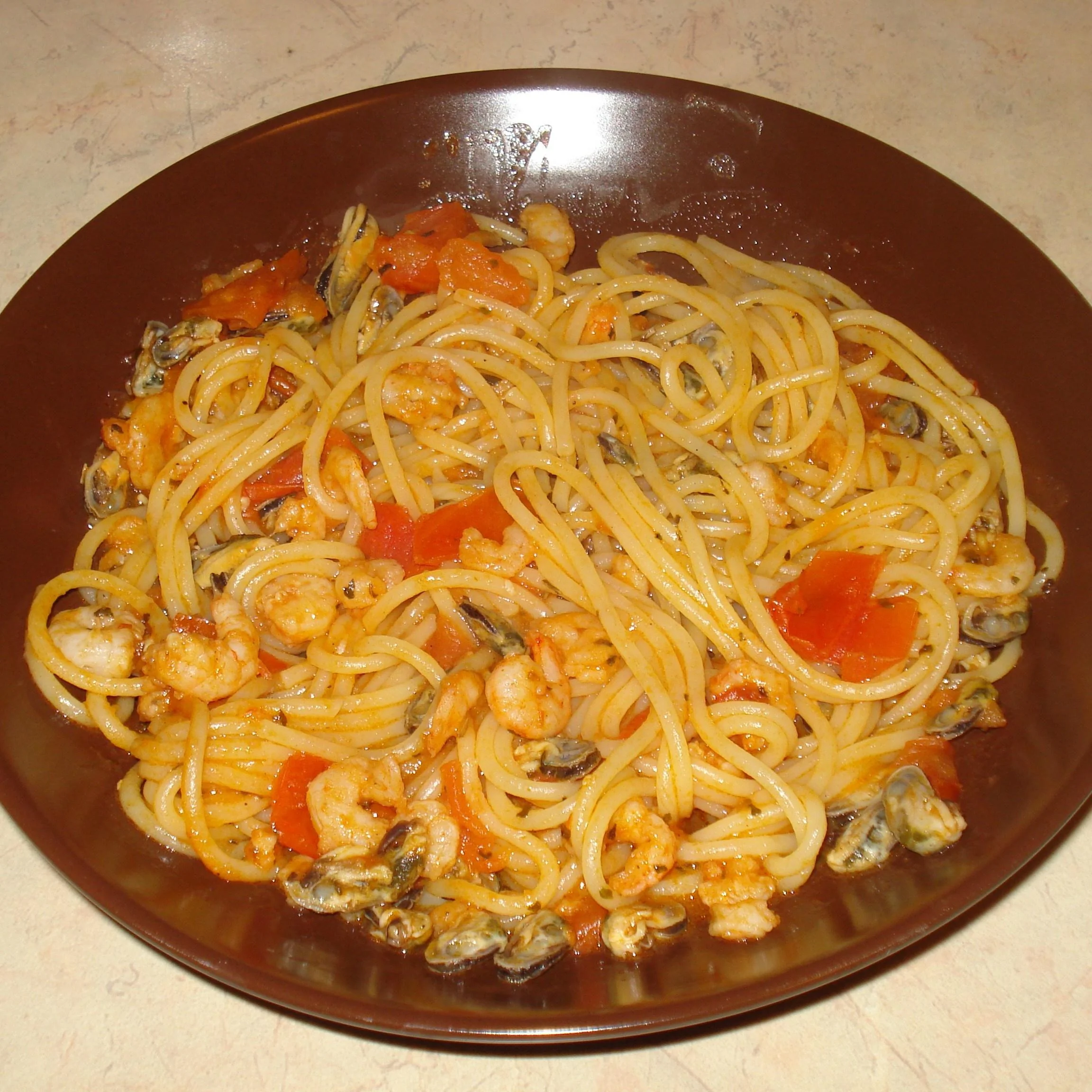 Ингредиенты для приготовления Спагетти с морепродуктами и помидорами черри: