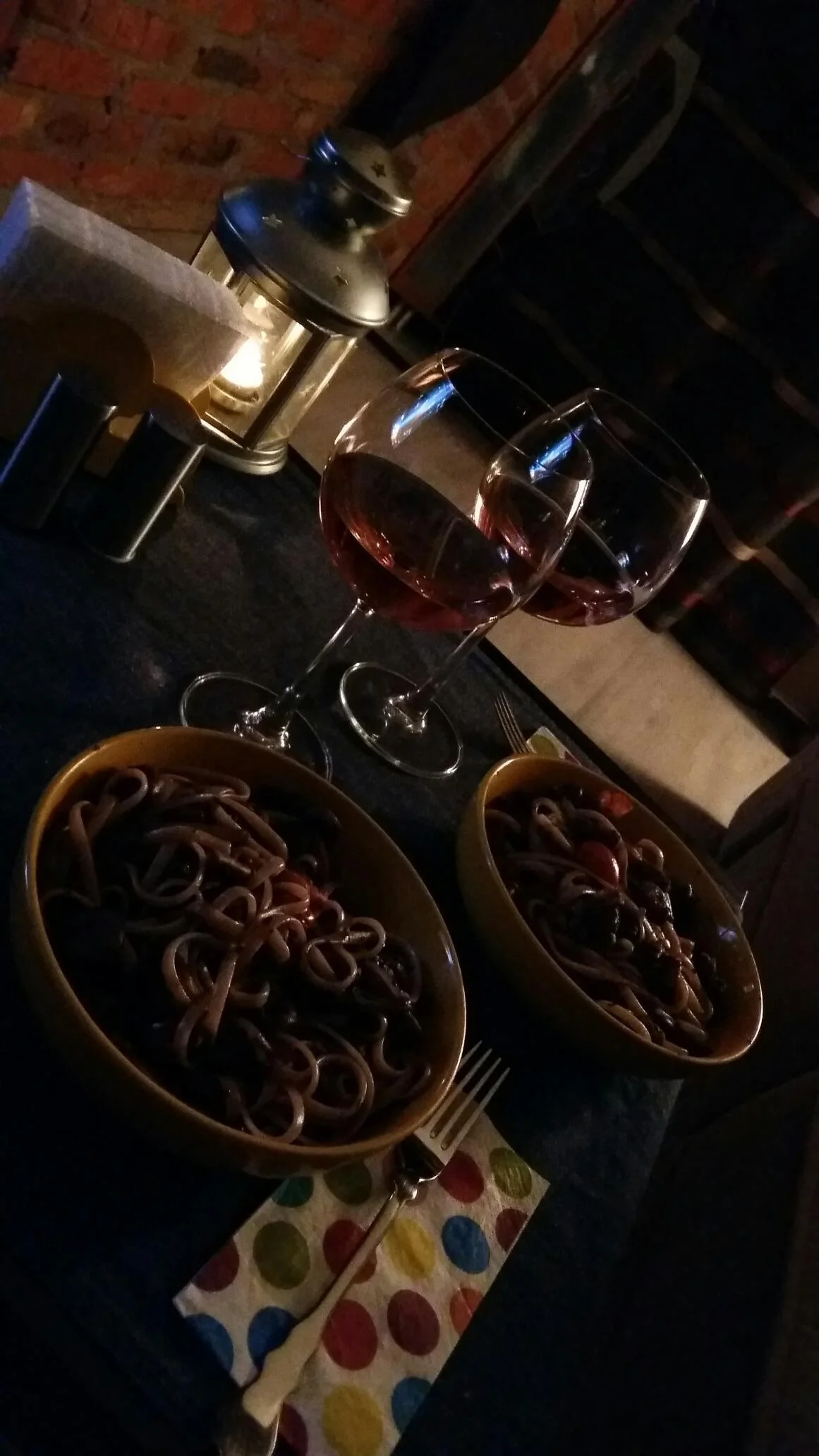 ШАГ 5 Выловить специальным половником с отверстием пасту из кастрюли и добавить к соусу с морепродуктами. Влить вино. Дать прокипеть. Посыпать сухим базиликом.
