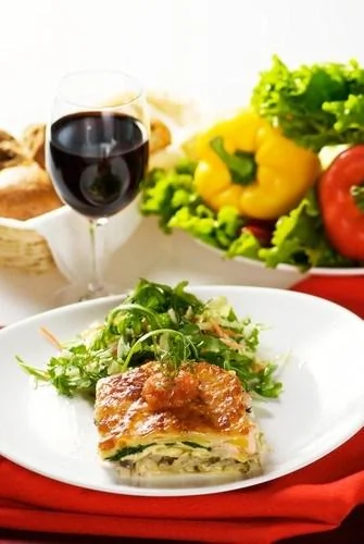 Свежая овощная лазанья с рукколой и бальзамическим сиропом
