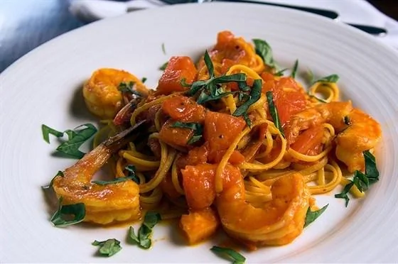 Паста с креветками, сливочно-томатным соусом и вермутом