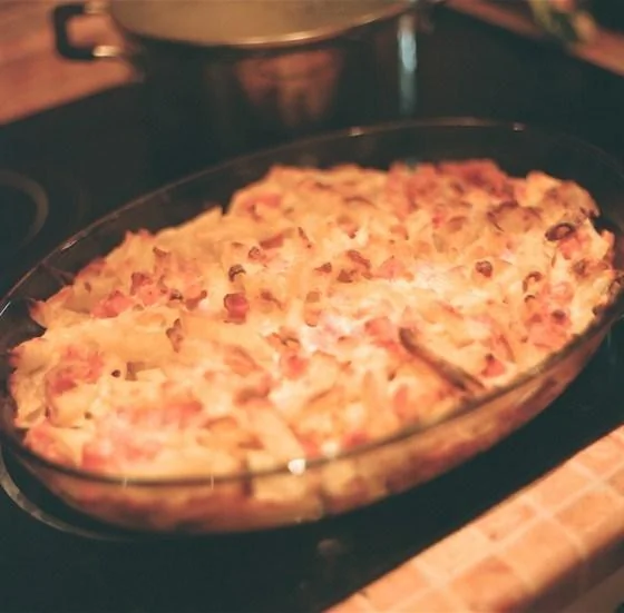 ШАГ 3 В большой миске готовые макароны залить соусом бешамель, засыпать сыром, ветчиной и перемешать.