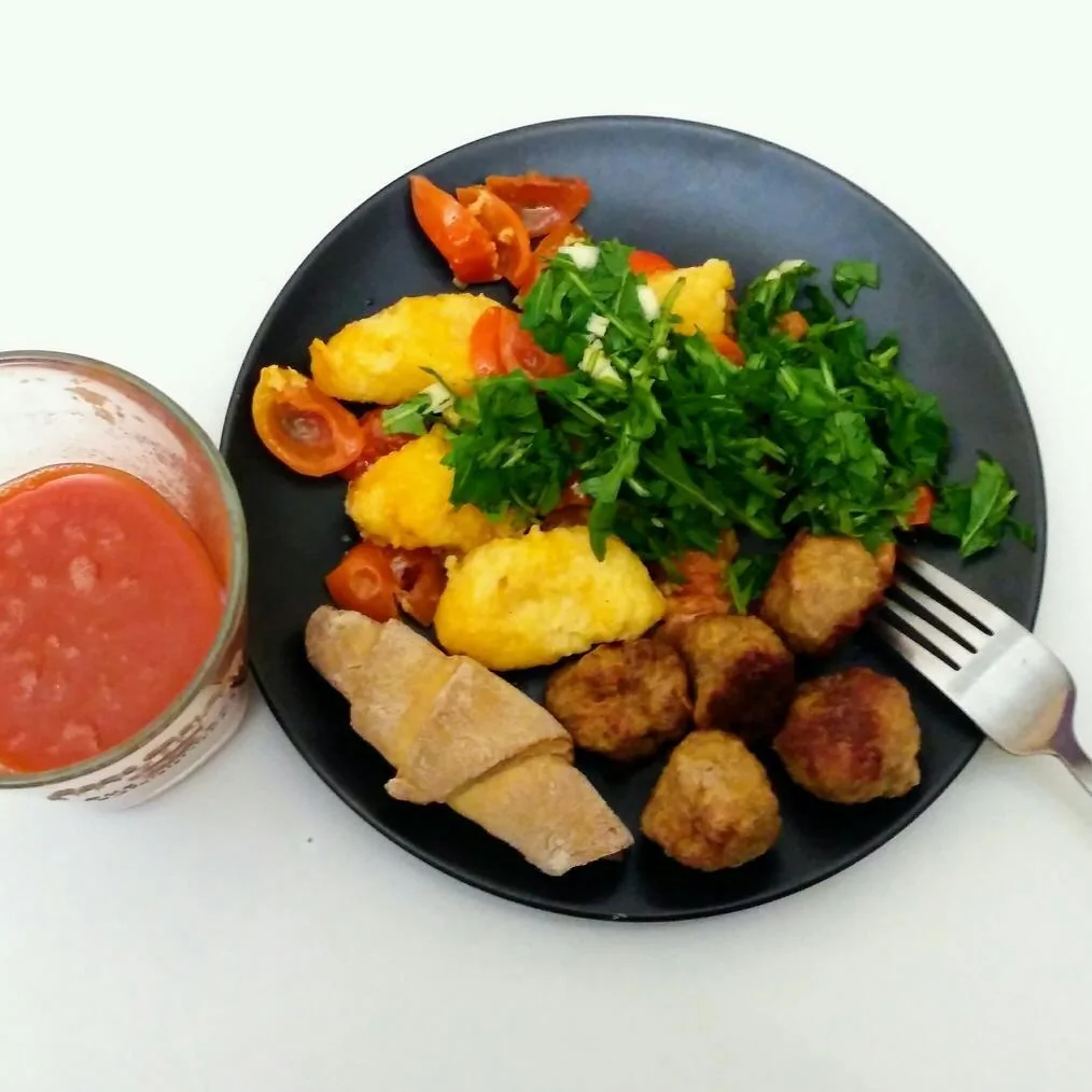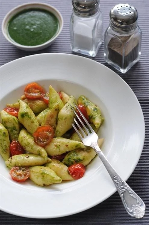ШАГ 5 Выложить в тарелку кнели с томатами, полить руккольной заправкой и посыпать свежим тимьяном.