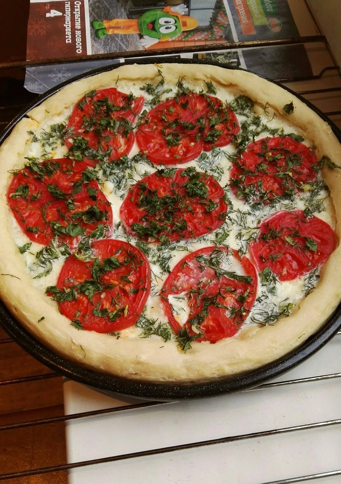 ШАГ 2 Раскатать тесто в виде круглой тонкой лепешки, положить в неглубокую форму или сковороду. Сверху положить кусочки моцареллы, порезанные кружочками помидоры. Посыпать чесноком и зеленью.