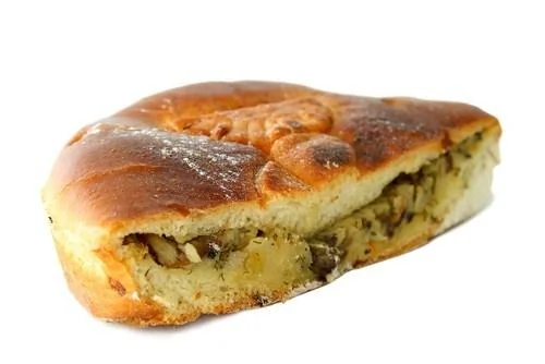 ШАГ 6 Один круг выложить в форму, смазанную растительным маслом, на него положить начинку из процеженных угрей и картофеля, покрыть другим кругом, защипать края и поставить в горячую духовку на 40 минут.