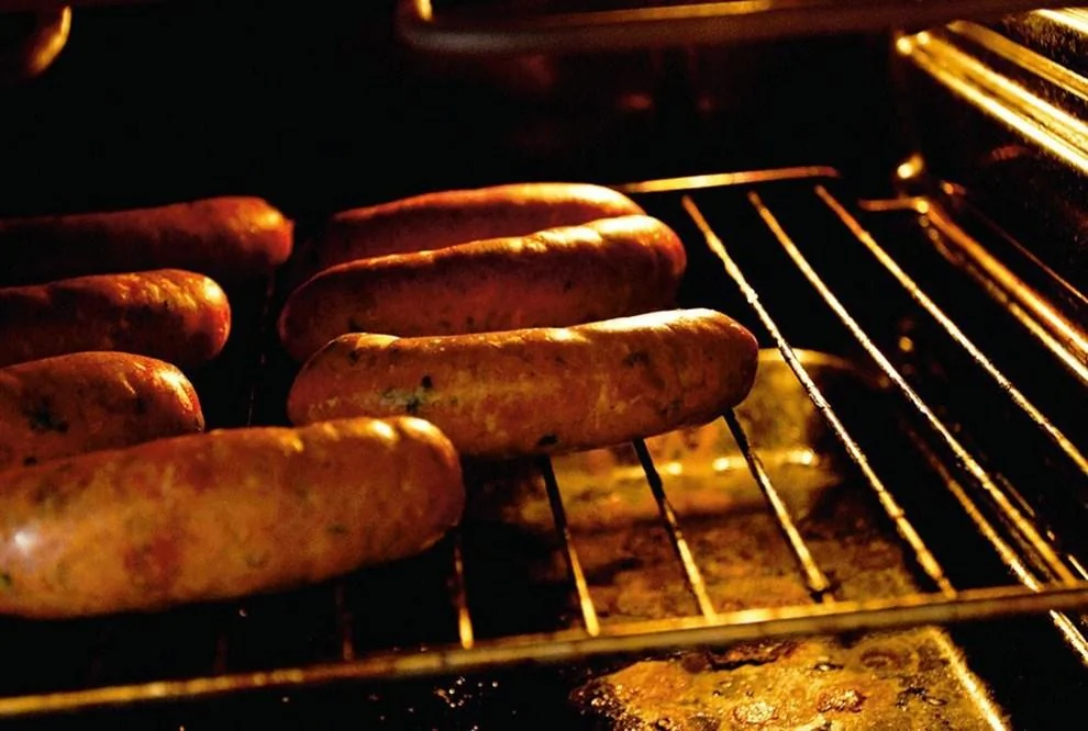 ШАГ 8 Разложить колбаски на решетке и отправить в разогретую до 190 градусов духовку. Под решетку лучше поставить поддон, потому что с колбасок будет капать жир. Минут через 15, когда они будут почти готовы, перевернуть — чтобы колбаски равномерно прожарились. Оболочка должна стать золотисто-коричневой и хрустела на зубах. Всего на это уйдет двадцать минут.