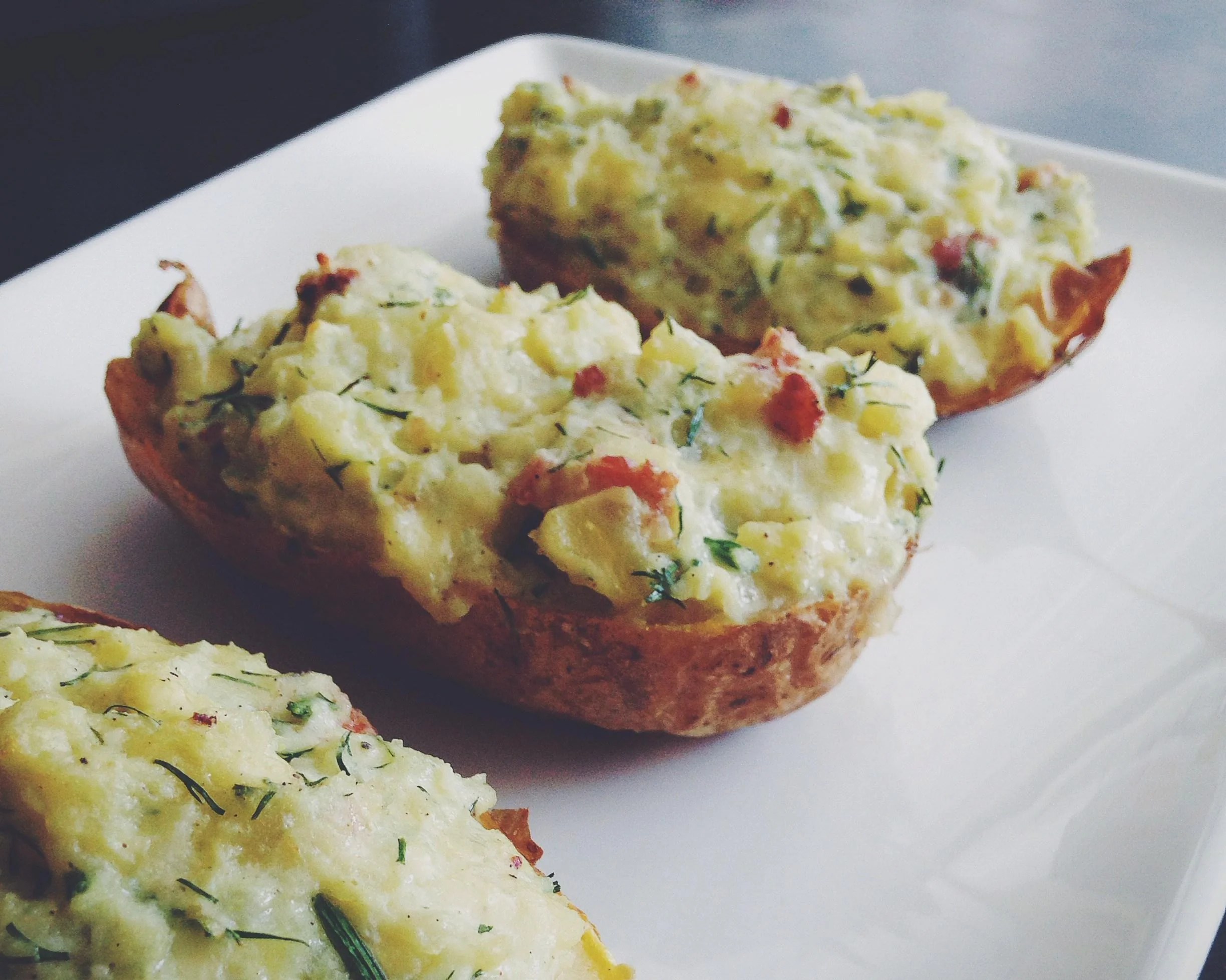 ШАГ 6 При помощи столовой ложки начинить получившимся фаршем каждую картофельную половинку и выложить их шкурками вниз на широкий противень. Хорошо разогреть гриль в духовке.