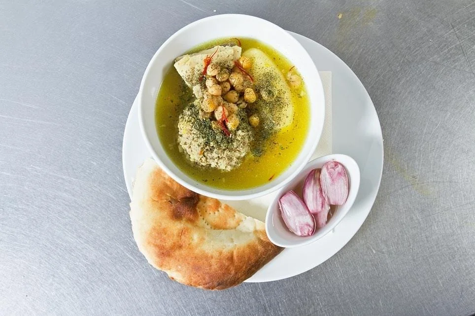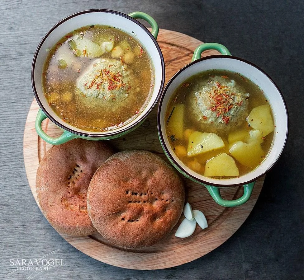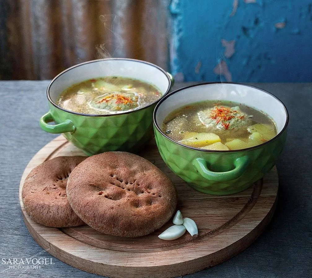 ШАГ 7 Перед подачей бульон снова процедить от выделившегося лишнего риса, лука и нутовой шелухи. В глубокую посуду выложить грудинку, кюфту, нут и картошку. Наполовину залить их бульоном. По вкусу можно посыпать сушеной мятой и барбарисом. Отдельно к гороховой похлебке подается маринованный лук и лепешка.