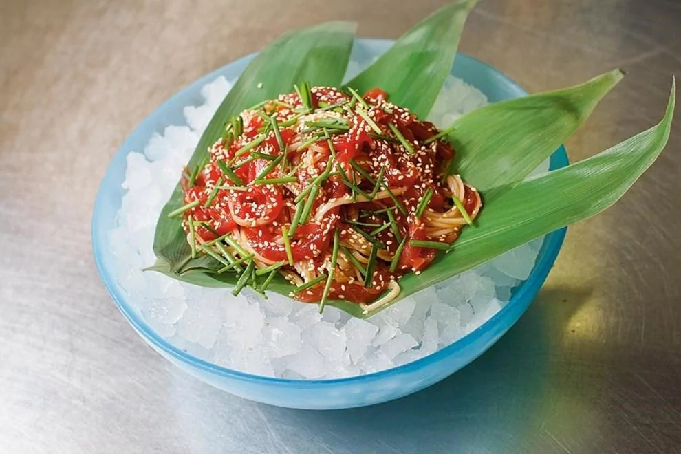 ШАГ 2 Отварить лапшу (или тонкие итальянские макароны вроде капеллини) до состояния аль денте — чтобы внутри зуб все же встречал сопротивление. Когда лапша будет готова, откинуть ее на сито и перенести в миску с ледяной водой. Там, энергично работая палочками, охладить лапшу и убедиться, что она нигде не слиплась.