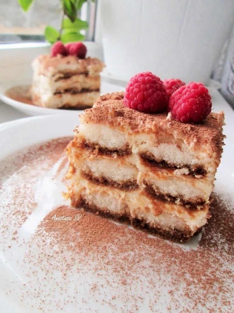 ШАГ 8 Острым ножом аккуратно разрезать тирамису на порции и разложить по тарелкам. Подавать десерт сразу, до того как крем успеет согреться до комнатной температуры и начнет таять.