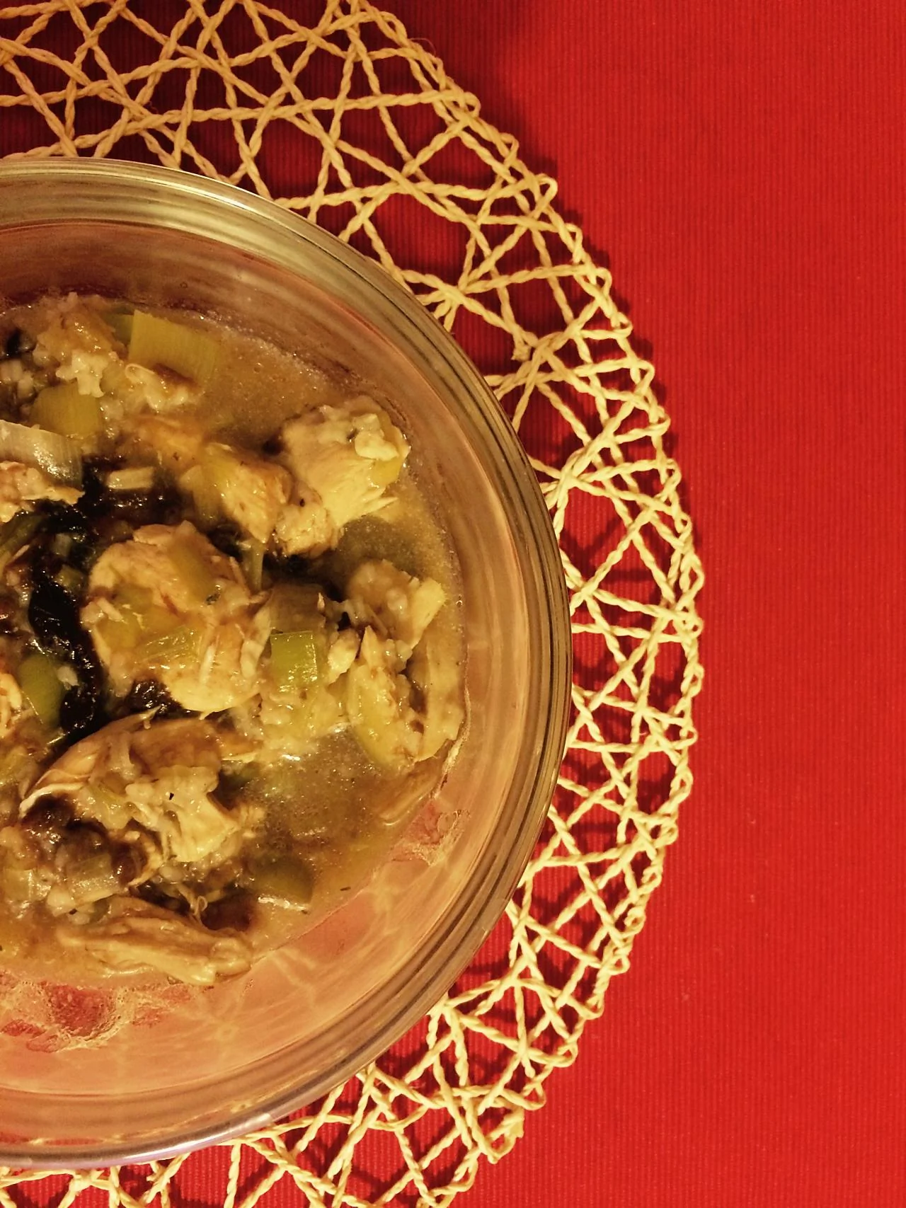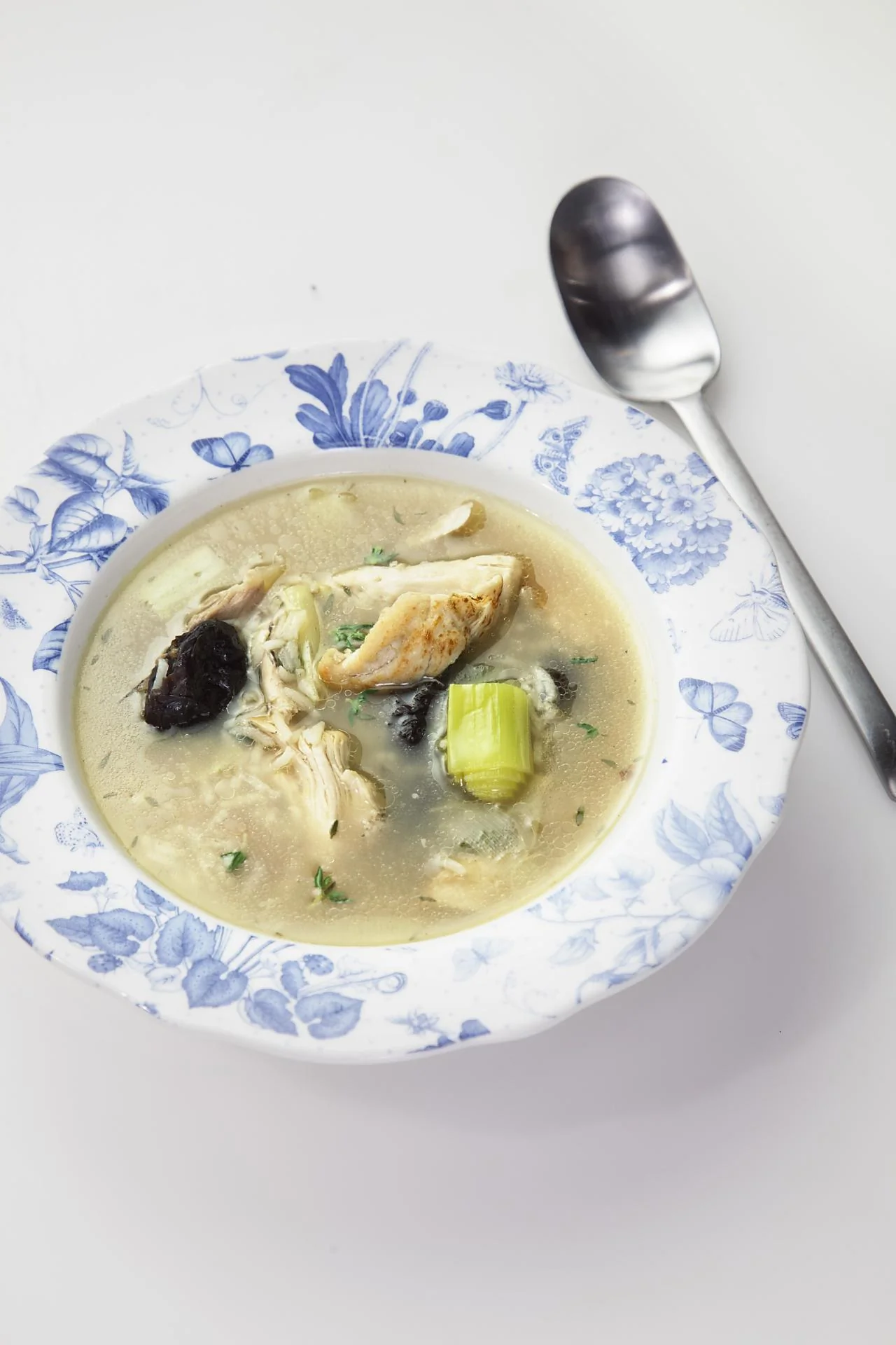 ШАГ 4 Вынуть из бульона куски курицы, положить на их место чернослив и насыпать рис, посолить и поперчить. Варить еще двадцать минут.