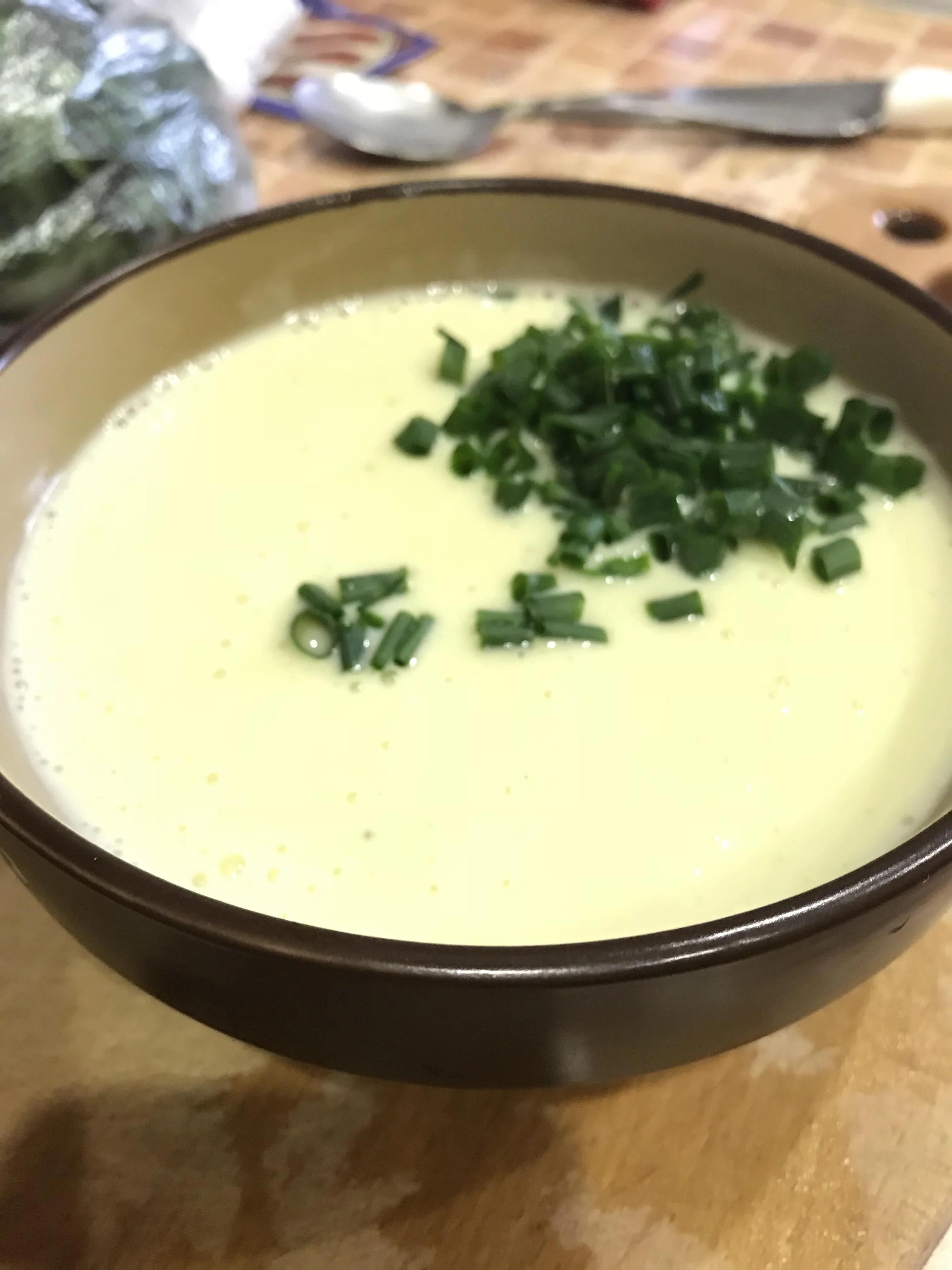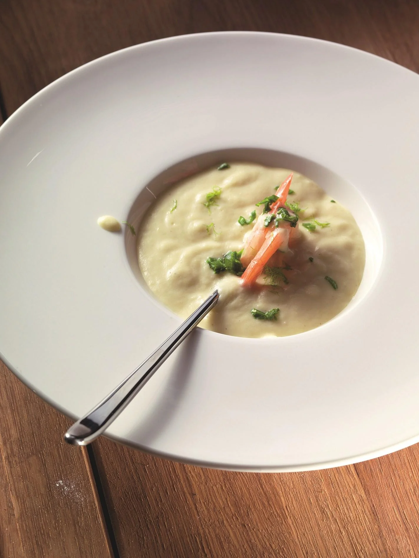 ШАГ 3 Готовый суп взбить в блендере вместе с холодными сливками до нежного пюреобразного состояния. Для пущей нежности можно протереть суп через мелкое сито. Охладить и подавать, посыпав мелко нарубленным зеленым луком. Во французской традиции вишисуаз часто подают с салатом из слегка обжаренных с чесноком креветок и мелко нарубленного фенхеля, смешанного с лимонным соком и оливковым маслом.