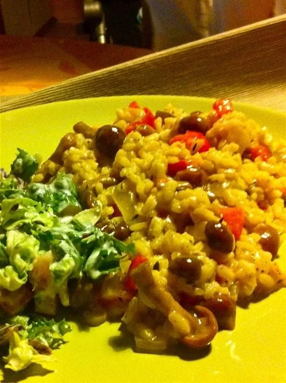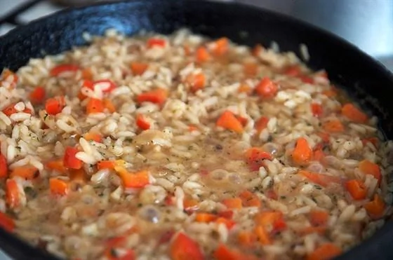 ШАГ 4 Всыпать перцы в сковороду с полуготовым ризотто, посолить, поперчить, перемешать, долить бульон и продолжать ту же канитель с варкой — помешивать, доливать бульон.