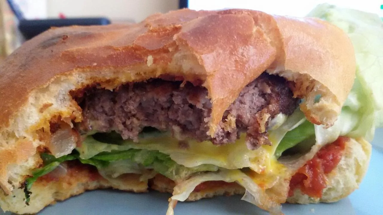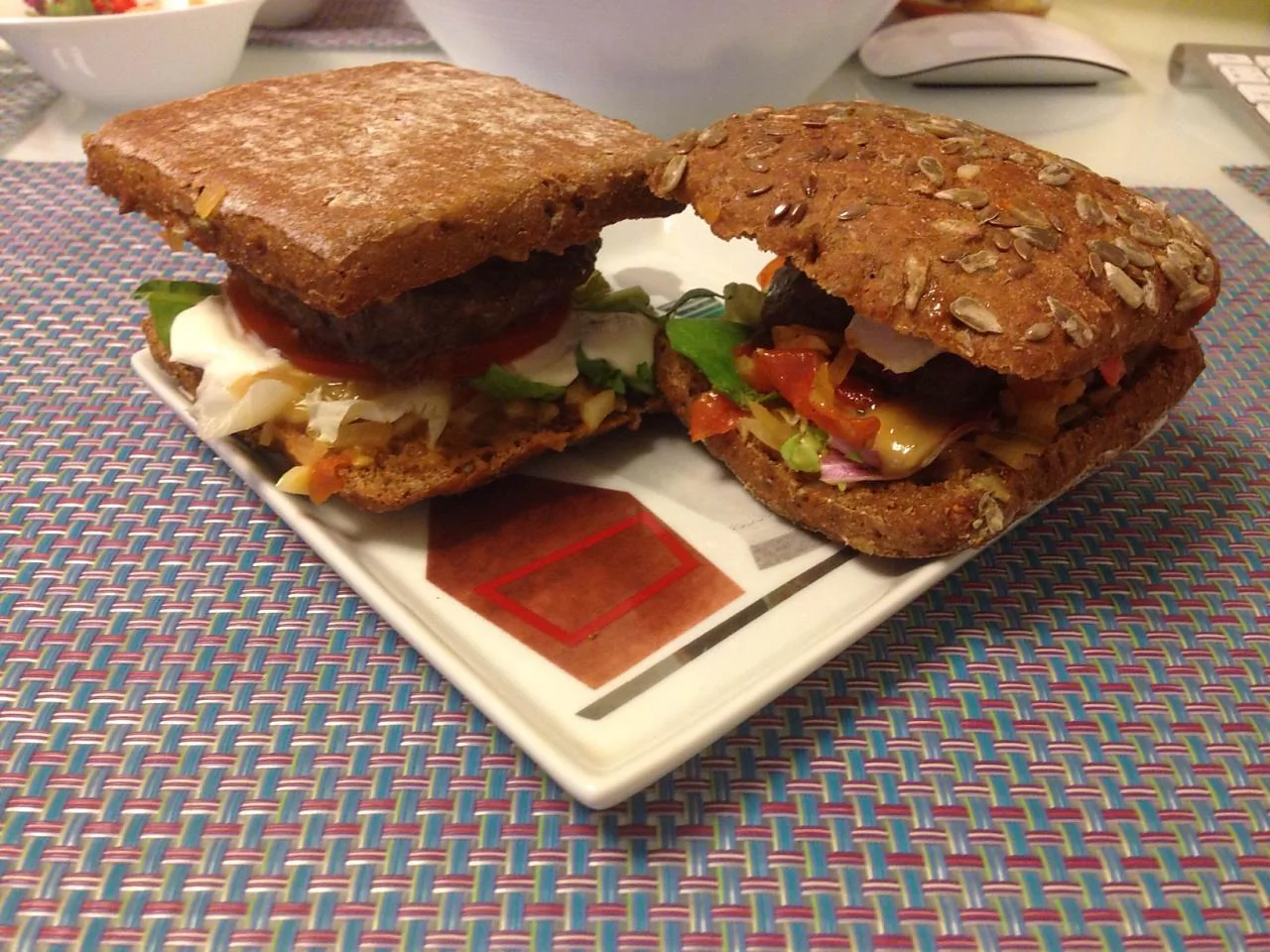 ШАГ 4 Подогретые куски хлеба намазать получившимся соусом, положить сверху салатных листьев, нарубленных в тонкую лапшу, несколько долек соленого огурца, майонез (можно приготовить самостоятельно) и горчицу, а на них — котлету. Накрыть второй половинкой булки, также смазанной соусами.