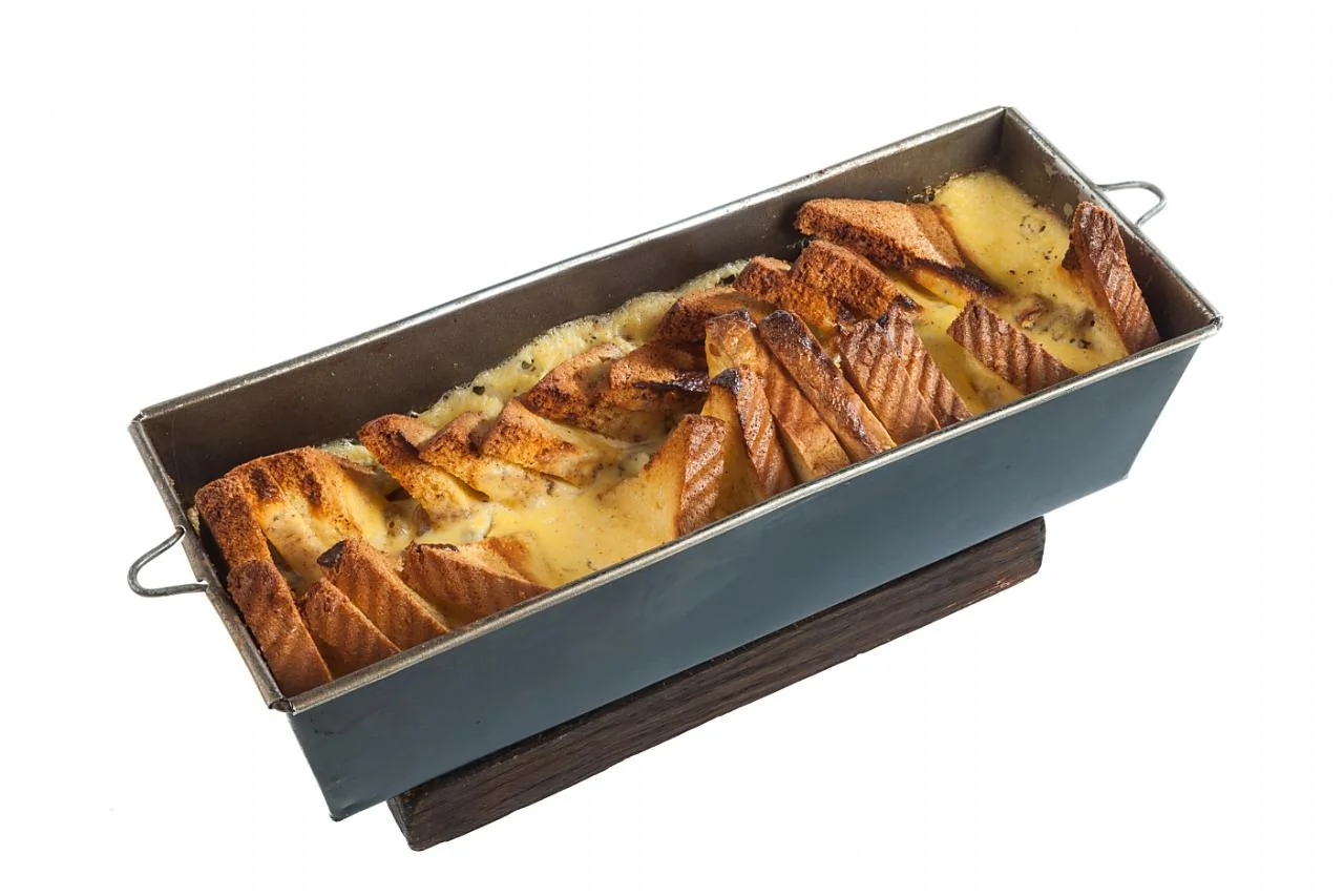 ШАГ 1 Хлеб намазать тонким слоем сливочного масла, разрезать каждый кусок на два треугольника. Заполнить ими смазанную маслом форму, посыпая хлеб изюмом и молотой корицей.