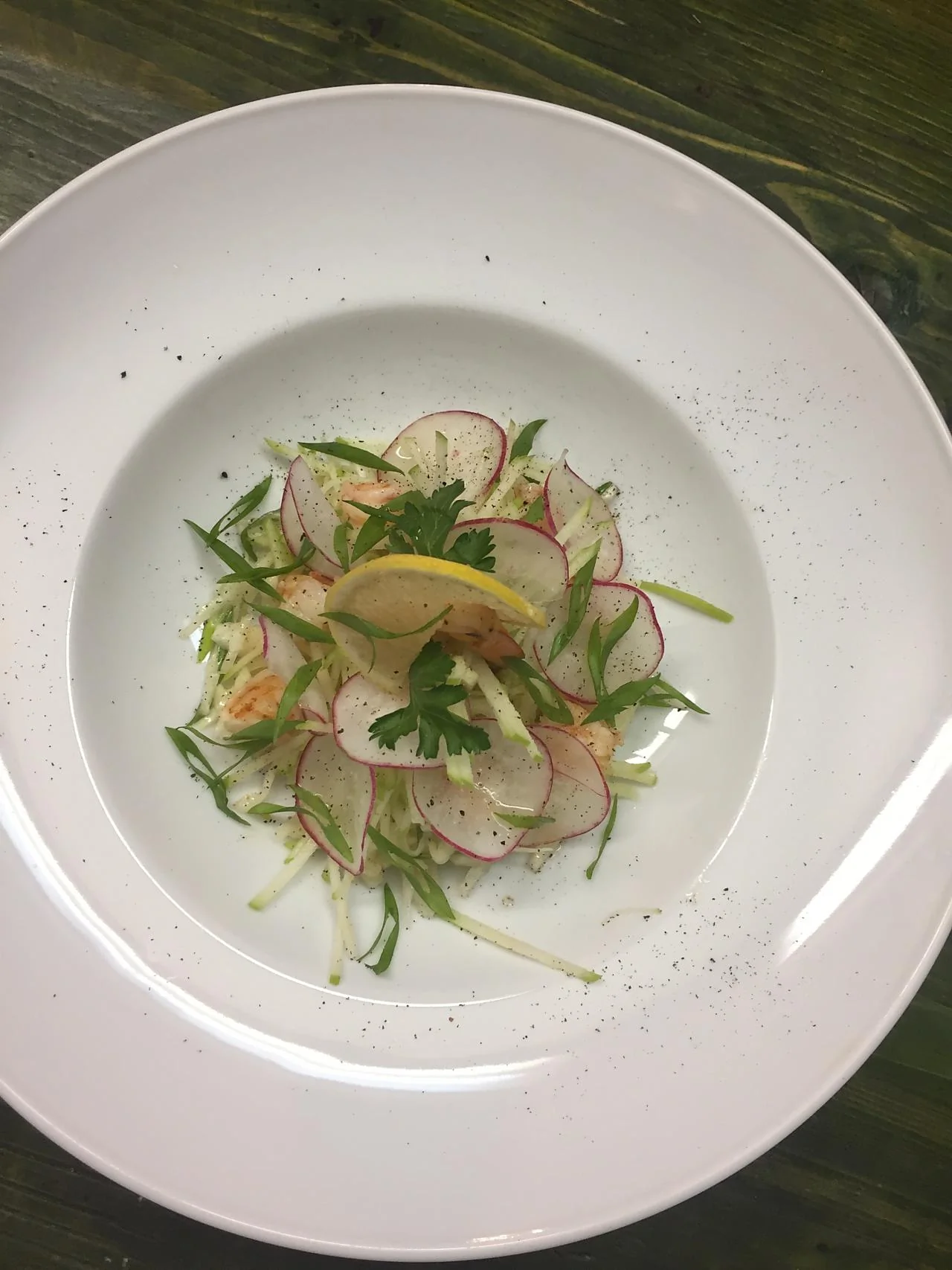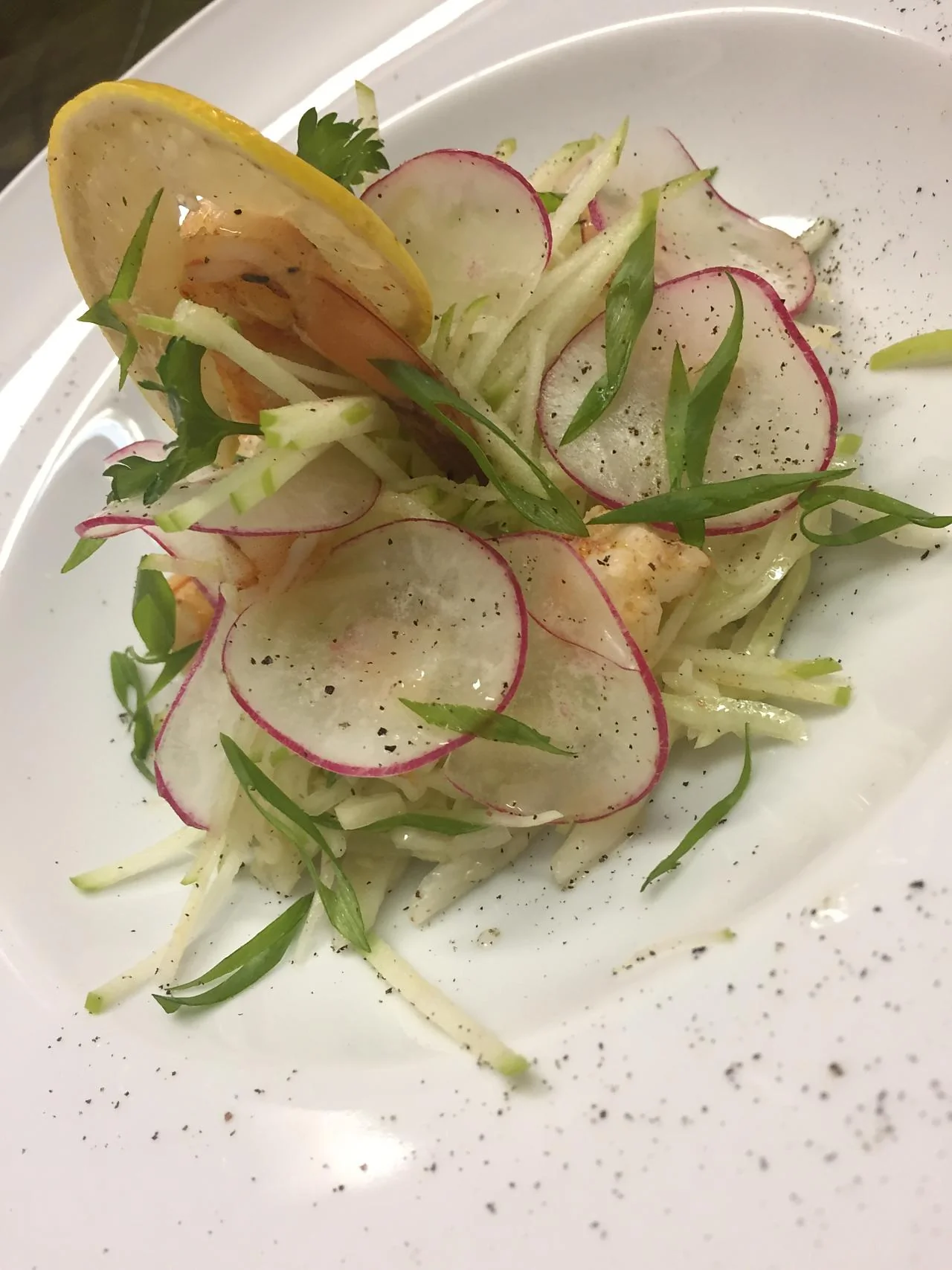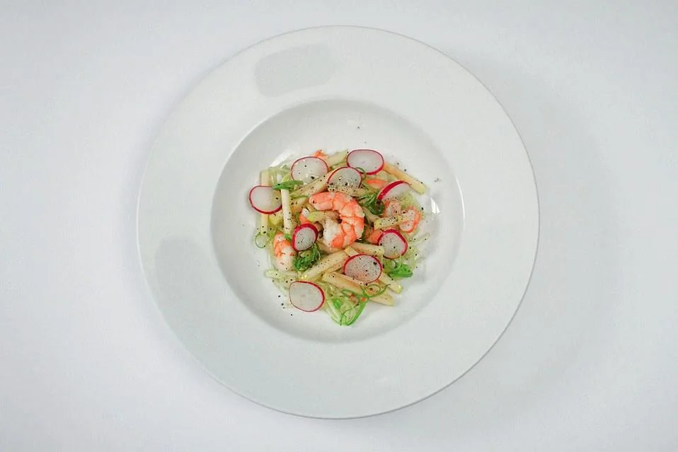 ШАГ 4 В центр большой тарелки выложить пропитавшуюся маслом со специями капусту (можно слегка отжать ее руками), сверху — нарезанные креветки, яблочную соломку и редис. Украсить кольцами порея и целой креветкой и полить оливковым маслом.