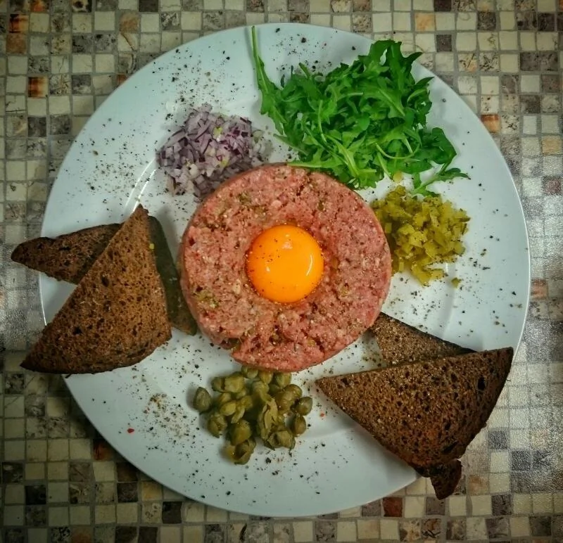 ШАГ 4 Каперсы, корнишоны и сваренные яйца нарезать кусочками такого же размера, как мясо, шалот — чуть помельче. Измельчить лук-резанец, листья базилика и петрушки. Добавить все это в майонез — и соус тартар готов. Две столовые ложки получившегося соуса, табаско, кетчуп и вустерширский соус смешать с говядиной.