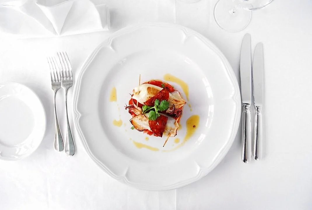 ШАГ 7 На тартар из помидоров выложить горячих фаршированных кальмаров, пристроить головы между ними, а кусочки чоризо поместить сверху. Полить блюдо небольшим количеством масла из сковороды, в которой все жарилось.