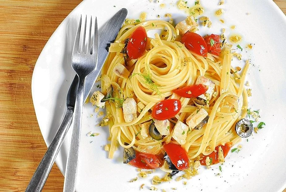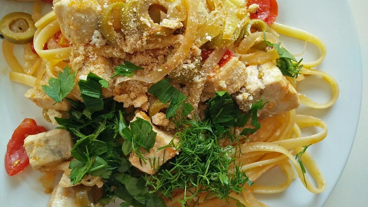 ШАГ 5 Баветте с меч-рыбой выложить на тарелки, украсить листьями фенхеля, посыпать хлебной крошкой и зеленью петрушки, полить столовой ложкой оливкового масла, посыпать черным свежемолотым перцем и тут же подавать.