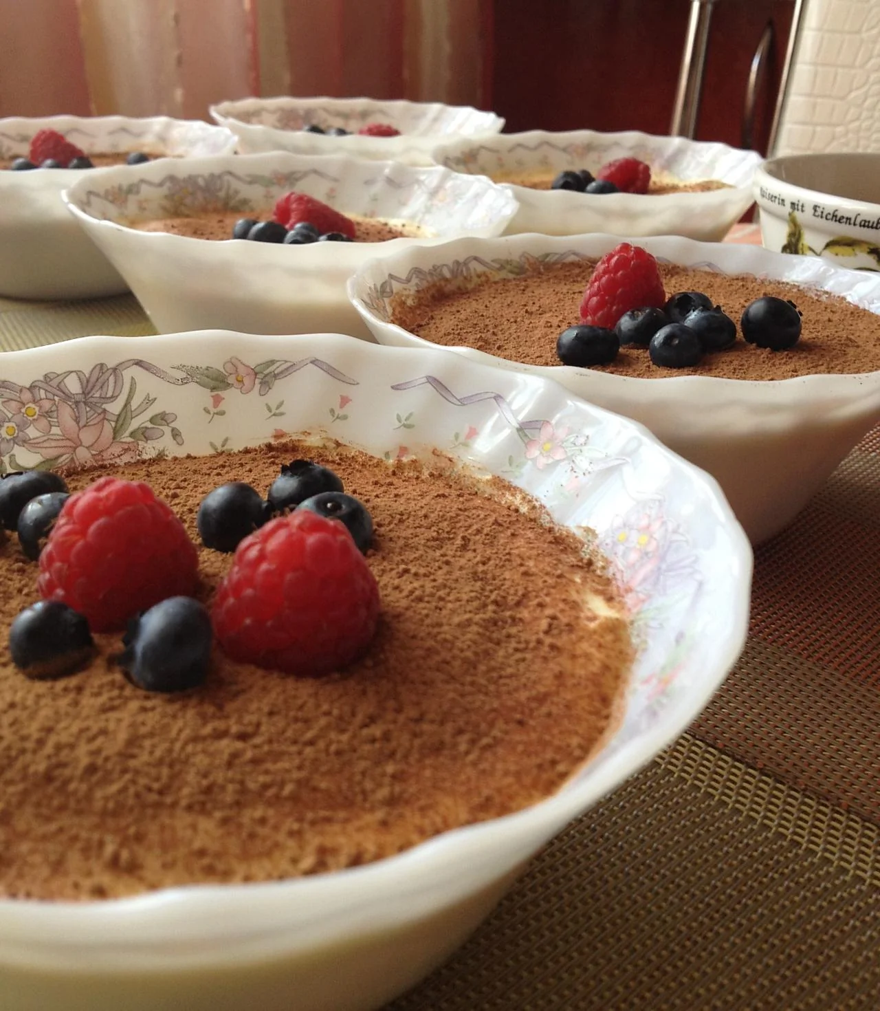 ШАГ 5 Готовый десерт посыпать какао, используя ситечко, чтобы не было комочков. Выложить в центр пиал с тирамису десяток ягод малины, украсить веточками мяты — и подавать.
