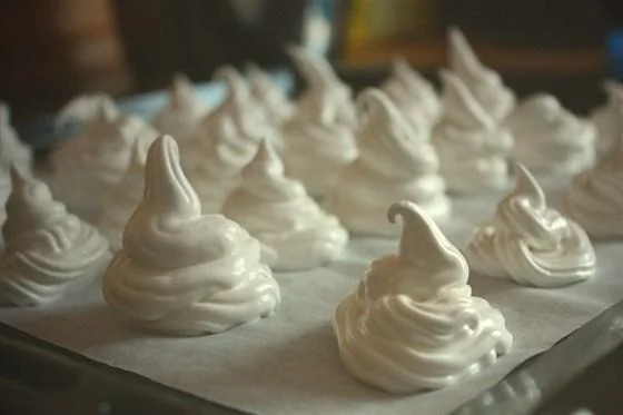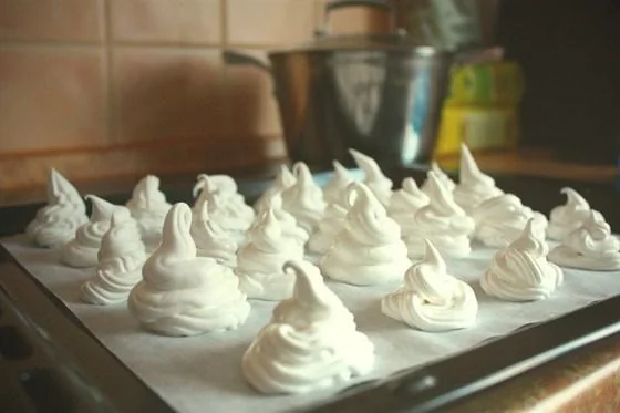 ШАГ 4 На противень кладем лист бумаги для выпекания, чтобы подходил по размеру. Ну и накладываем на него будущие безе в любой форме! Я делаю волшебные штучки с помощью пакетика с разными насадками (что-то вроде кондитерского шприца, только попроще). Можно сделать маленькие безе или большие. Маленькие, кстати, быстрее выпекаются. Ставим в духовку при 120 градусах, на 50–60–80 минут, можно периодически проверять. Если снаружи твердые, то пора вынимать.