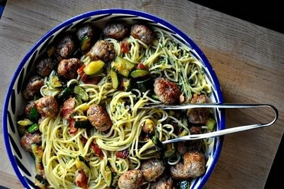 ШАГ 7 Переложить смешанную со сливочно-яичной заправкой пасту в сковороду с фрикадельками и цукини. Снова аккуратно перемешать и подогреть все вместе на умеренном огне.