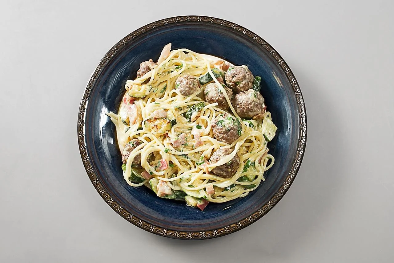 Ингредиенты для приготовления Карбонара с цукини и фрикадельками: